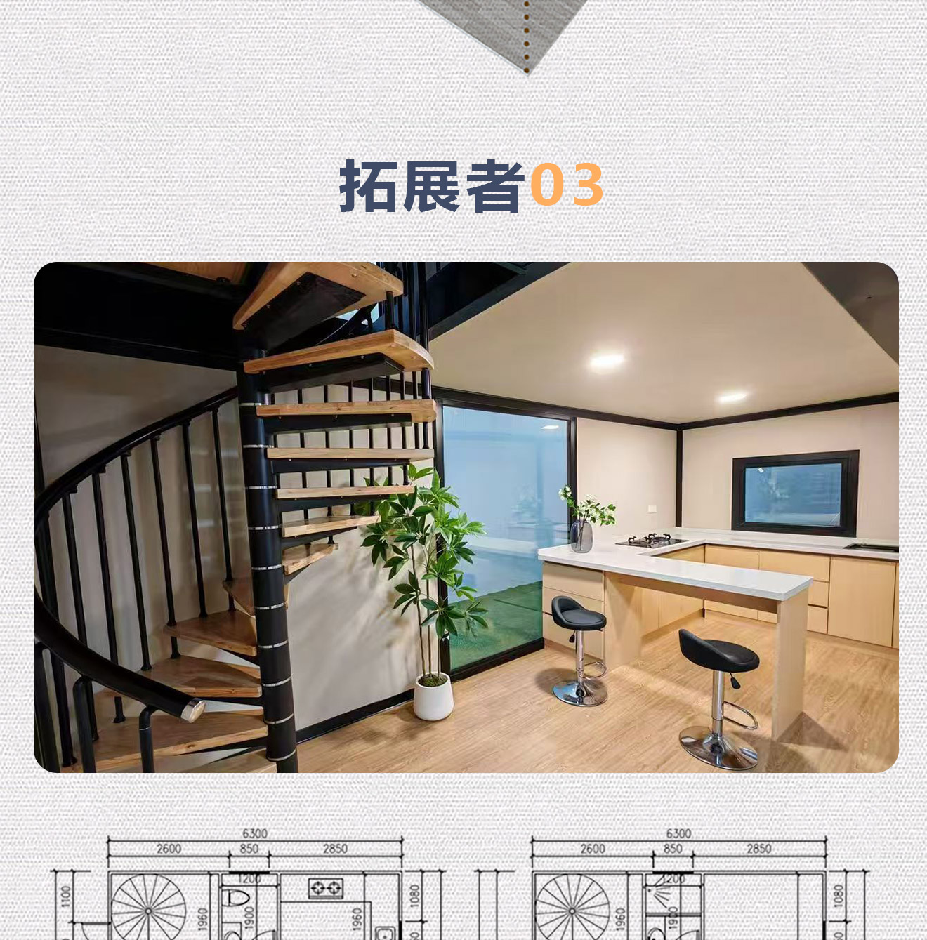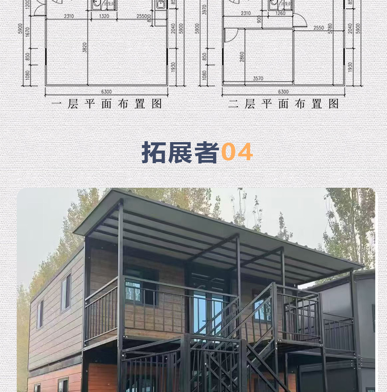 拓展者04 | L5900*W6300*H4960,外加露台L1500*W6300和L2000*W2650楼梯 | L11800*W2200*H2480 | L5640*W6140*H2240(单层) | 34.63㎡ | 5200 | 2200 |